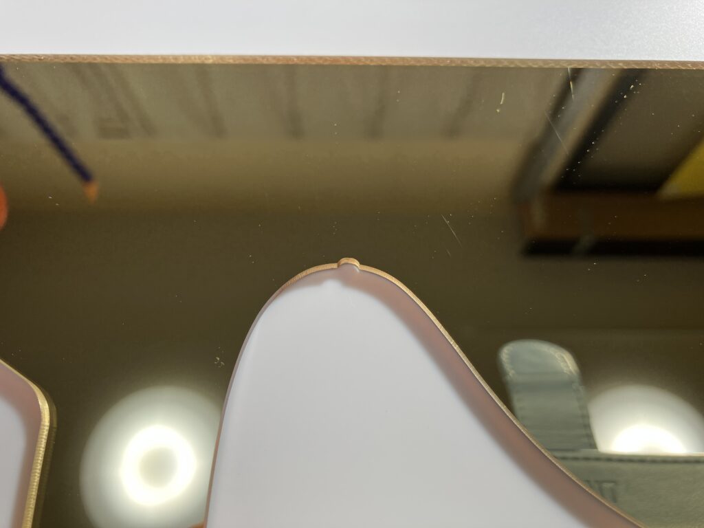 材料のアクリルミラーゴールドの表面にブルーの保護フィルムを貼ってNCルーターで加工します。