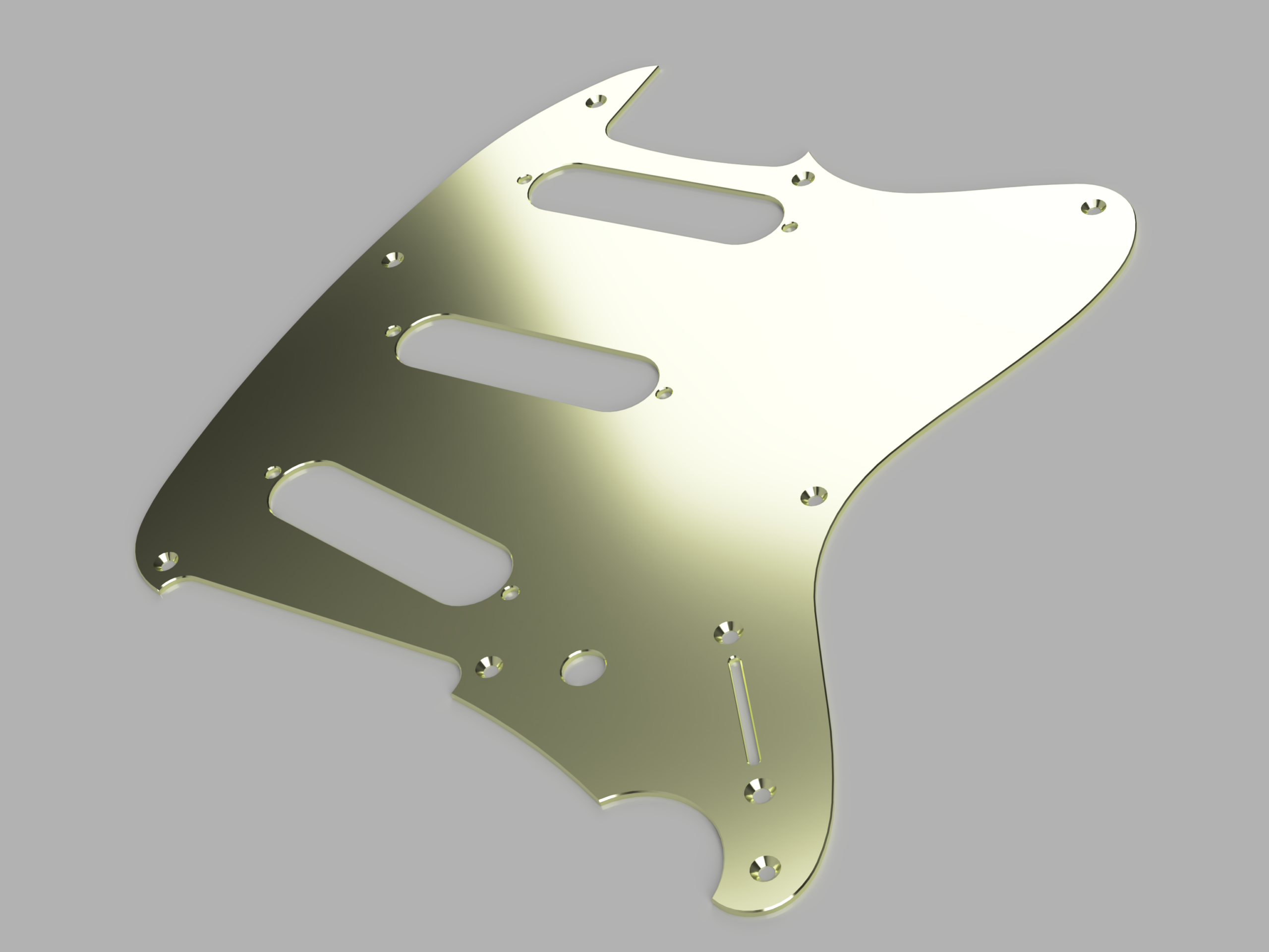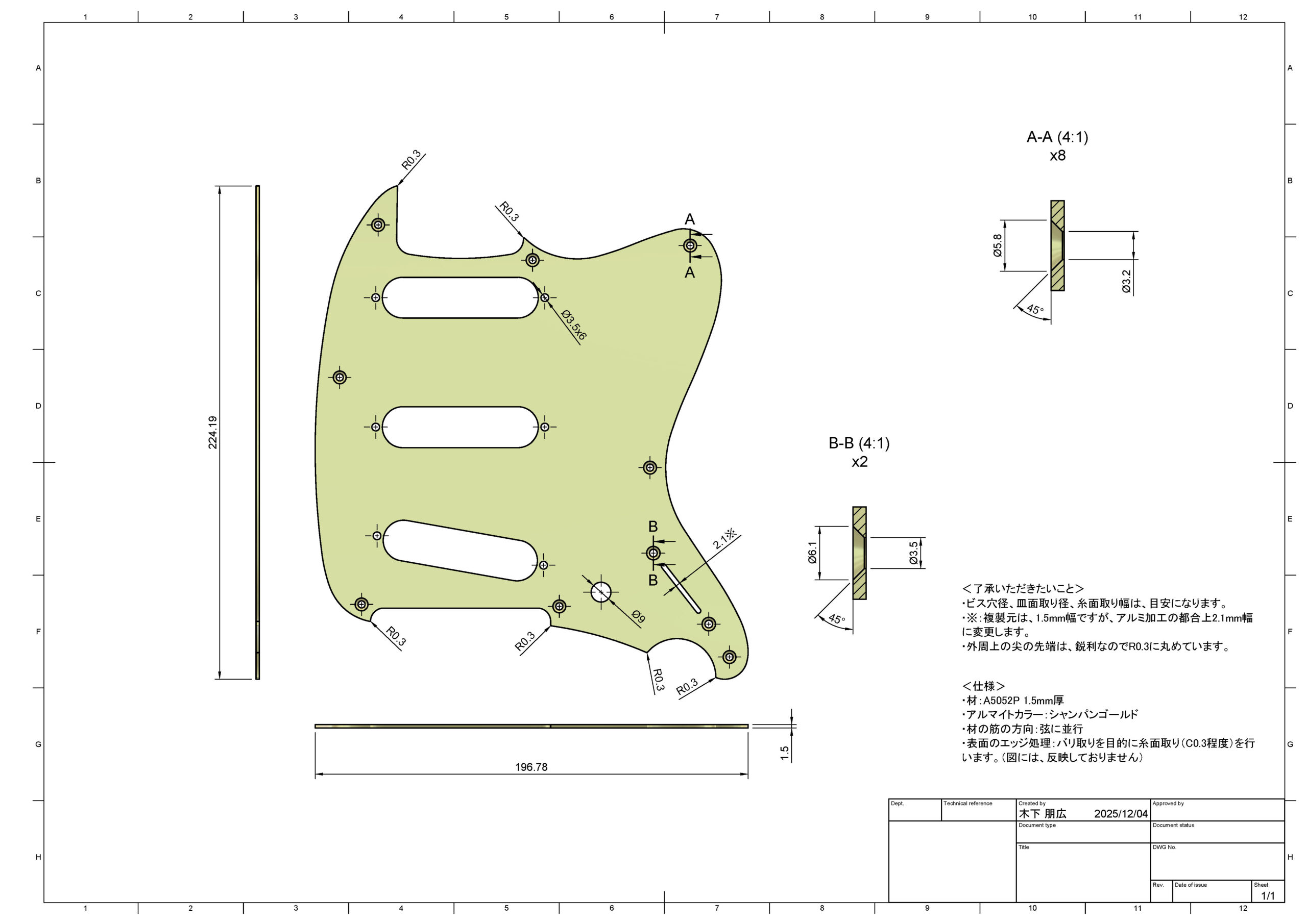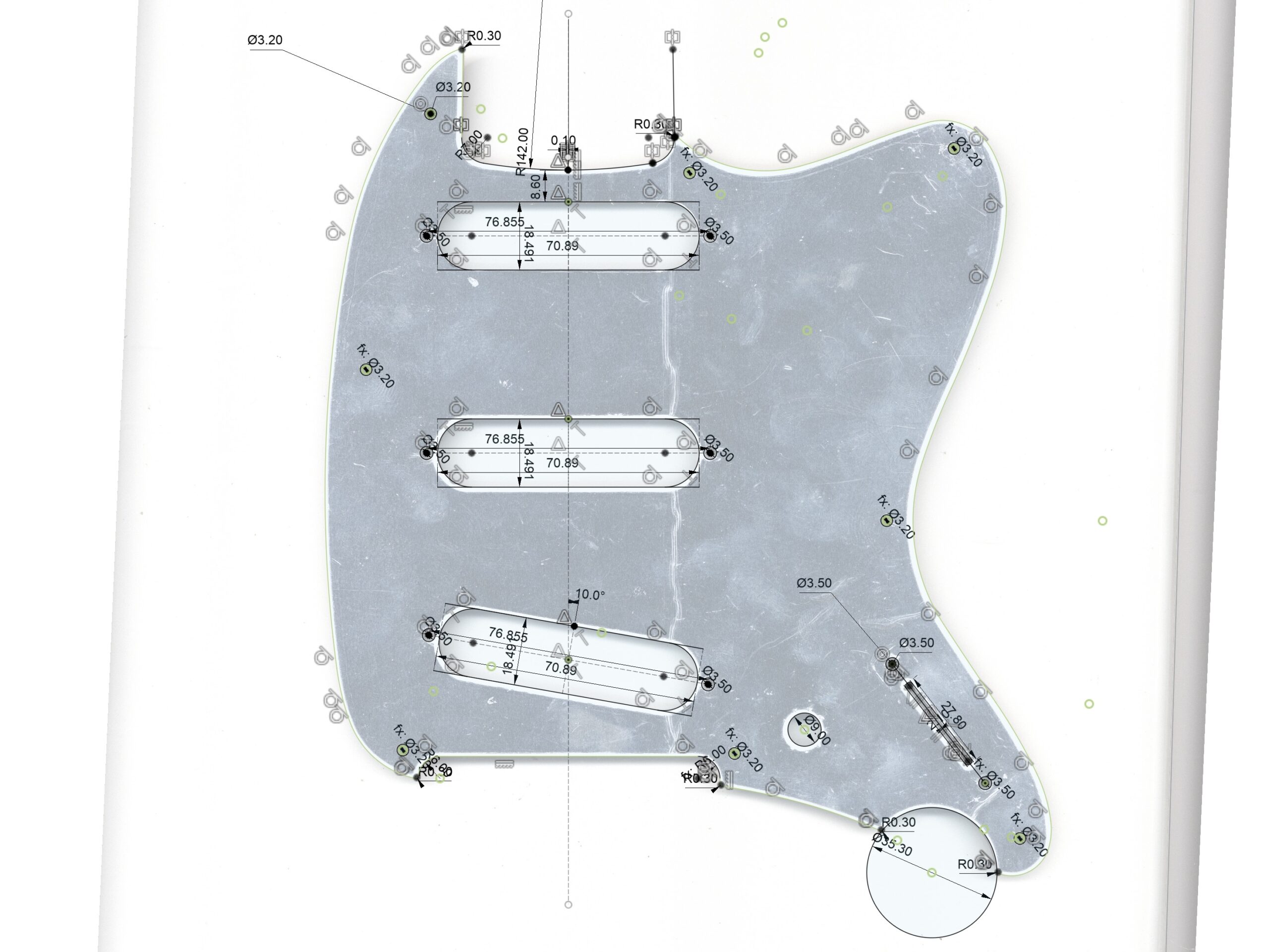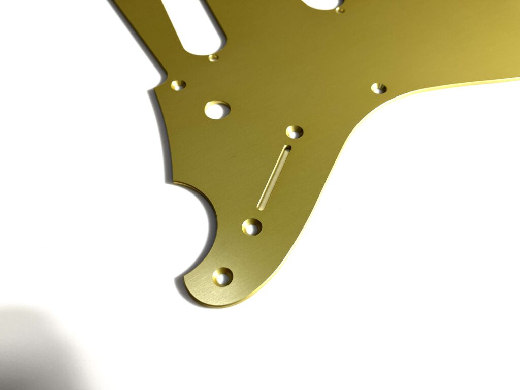 2026年1月17日 / 最終更新日時 : 2026年1月17日 kinoshita tomohiro オーダー Ibanez Talman アノダイズド ピックガード オーダー 変更なしで複製を製作します。 <完成品> アルミは、1.5mm。アルマイトのカラーは、シャンパンゴールド。 <設計> 複製元をお預かりします。 CADでトレースします。 モデリングします。 図面で確認いただいてから加工へ進めます。 <加工> NCルーターで加工します。 <完成> カラーアルマイト処理をして完成です。 オーナー様の了承を得て掲載しています。