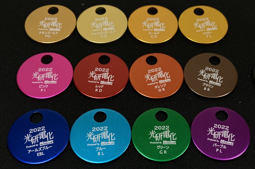 - アルマイト処理のカラーは、下の画像のカラーサンプルの12色(※)、白(無染色、光沢なし)、黒(光沢なし)、ブラック(少し光沢あり)の15色になります。